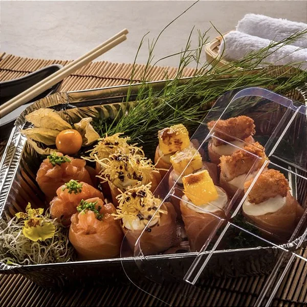 Bandeja de alumínio descartável Wyda Retangular, utilizada por comércios e indústrias alimentícias como em supermercados, restaurantes, lanchonetes, churrascarias, entre outros. São bastante utilizadas por conseguir manter a temperatura do alimento por mais tempo.