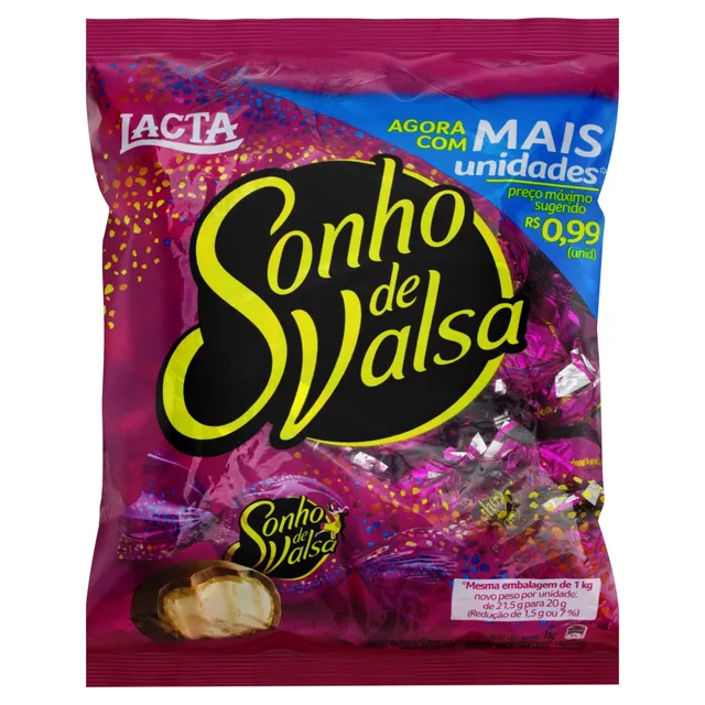 Se você é apaixonado por chocolate e adora saborear um pedacinho ao longo do dia, precisa ter sempre por perto. Perfeito para consumir puro ou preparar diversas receitas e no tamanho ideal para compartilhar com quem você gosta. O pacote de Bombom Lacta Sonho de Valsa 1kg é tudo que você queria. O bombom queridinho dos brasileiros ganhou embalagens herméticas individuais que conservam toda a crocância que Sonho de Valsa tem por muito mais tempo. Além disso, agora o produto possui o selo de porção controlada, que precisa atender critérios nutricionais pré-estabelecidos para uma ingestão consciente de calorias. Ele traz a irresistível combinação de um recheio cremoso de amendoim e castanha de caju, com a deliciosa crocância da cobertura de chocolate. A embalagem de 1kg é a opção perfeita para você que tem vontade de um chocolatinho depois da sua refeição. Deixe o seu dia mais doce com Sonho de Valsa!