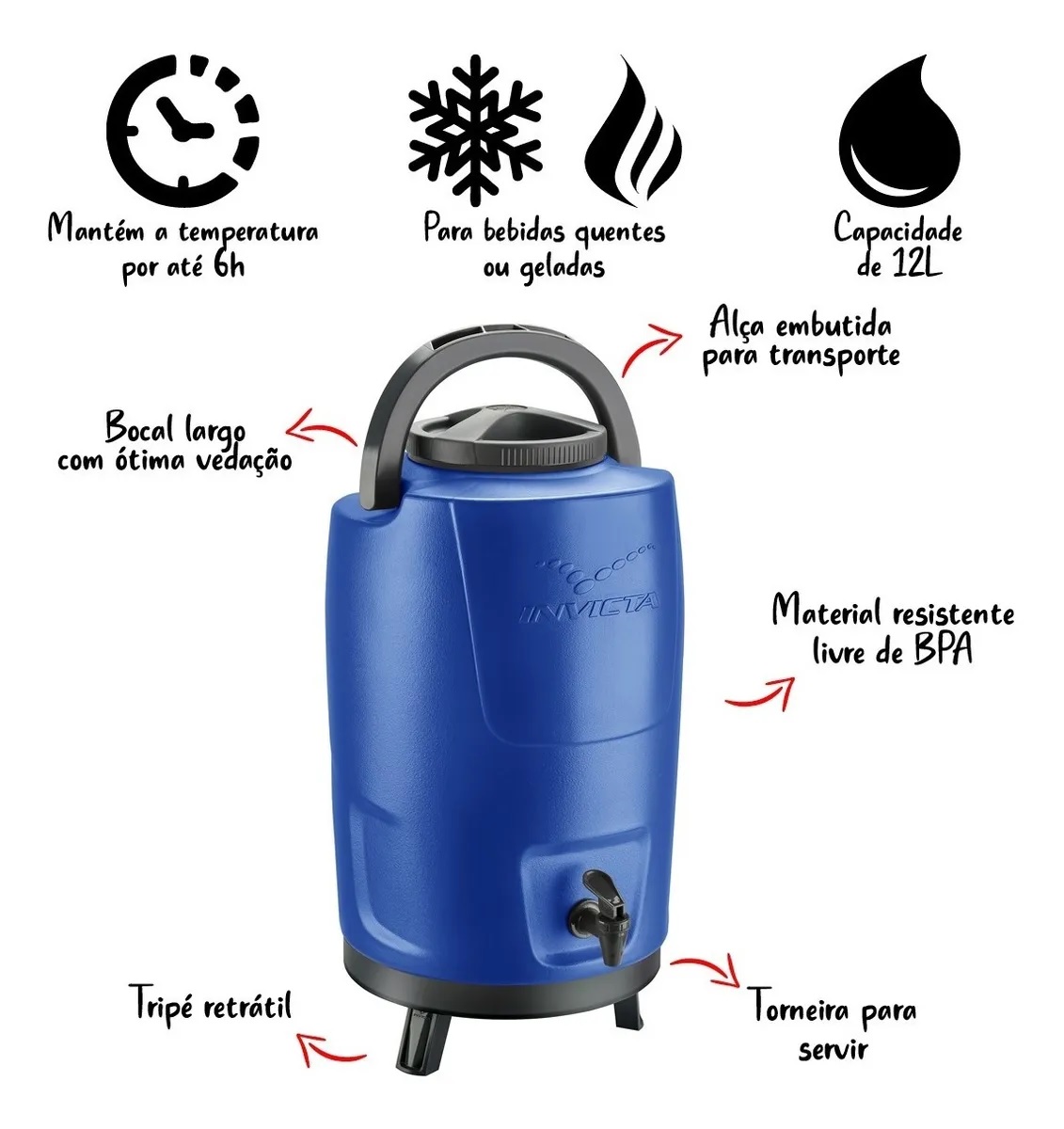 O botijão térmico com tripé retrátil Invicta possui design clean, bocal largo, alça embutida para facilitar o transporte.