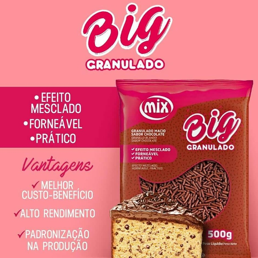 Granulado Forneável Big Macio Chocolate da marca Mix no peso de 500G Perfeito para massas e/ou bolos, fazendo um efeito mesclado que se junta à massa. Ideal também para confeitar doces. O granulado BIG é propositalmente maior que os granulados comuns e é prático no uso. Marca: Mix Peso: 500G Sabor: Chocolate Ao Leite