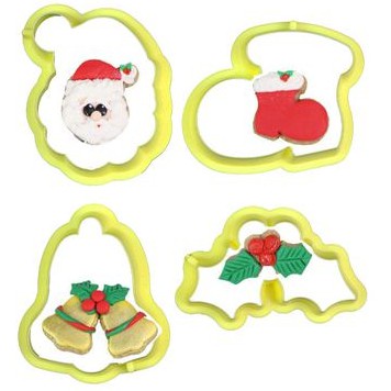 - Tamanho aproximado dos cortadores: rosto papai noel 5,5 X 4,5 cm (L X A); sino 3 X 5 cm (L X A); enfeite do sino 5 X 2,5 cm (L X A); bota 4,5 X 4 cm (L X A)
