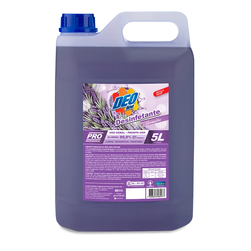 O Deoline Desinfetante – Sensações de uso geral é ideal para limpeza de pisos, paredes, corredores, banheiros, etc. Deixa o ambiente suavemente perfumado. Sua concentração facilita o transporte e a estocagem, podendo ser diluído conforme a necessidade.