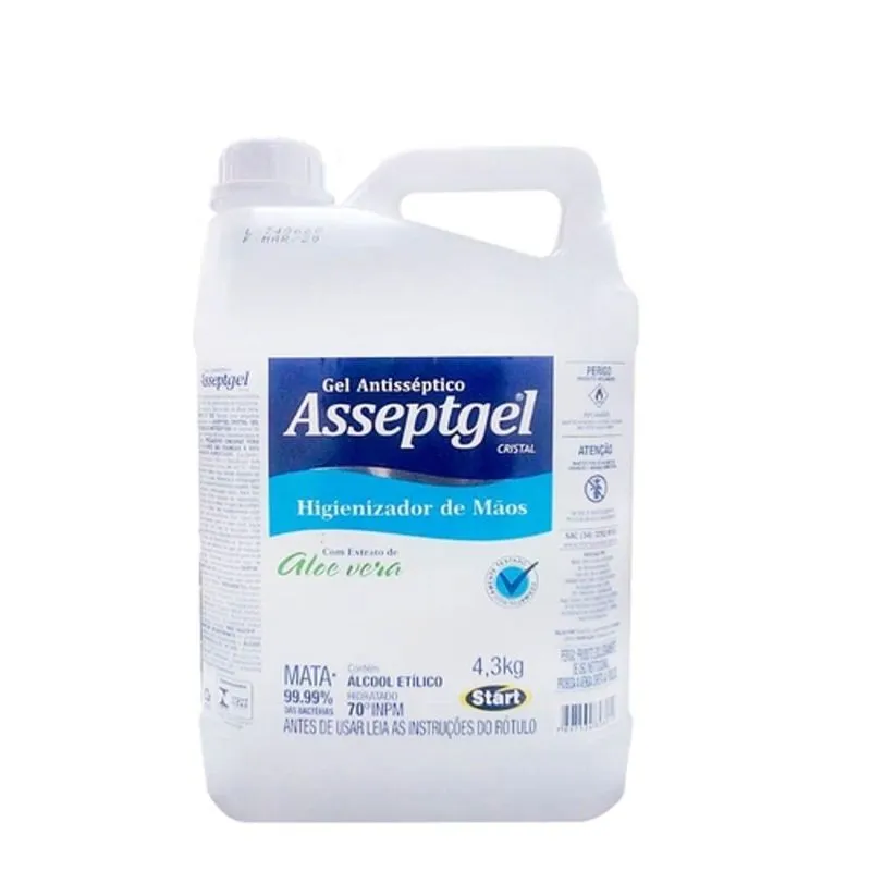 ASSEPTGEL CRISTAL elaborado como complemento na higienização de mãos. Gel a base de alcoóis com largo espectro de ação. Utilizado para completar a limpeza rotineira das mãos. COM ALOE VERA.