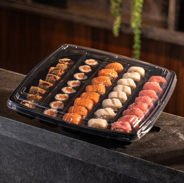 Dimensões: Int.: - x - x 4,7 cm Ext.: 32,4 x 32,4 x 5,4 cm Material: PET Qtd. por caixa: 20 cj Cor: Tampa: Cristal e Base: Preta Possibilidades de uso: comida oriental, sushi, fondue, petiscos.