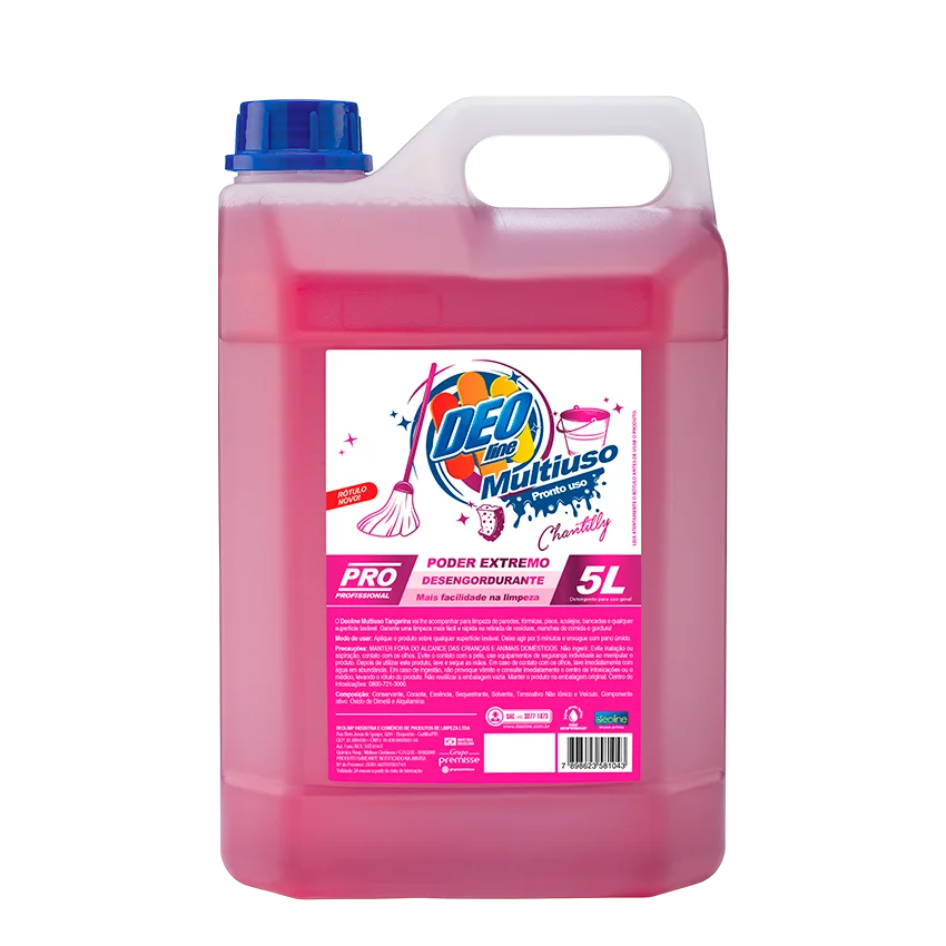 O Deoline Multiúso – Chantilly para limpeza geral. Ideal para limpeza de paredes, fórmicas, pisos, azulejos, bancadas e qualquer superfície lavável. Garante uma limpeza mais fácil e rápida na retirada de resíduos, manchas de comida e gordura, deixando um aroma agradável no ambiente.