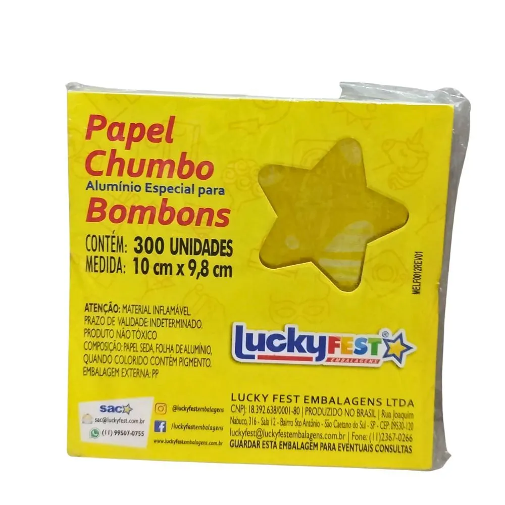 Papel Chumbo é a melhor opção para embalar com Elegância protegendo e preservando o sabor de seu chocolate. Com o Papel Chumbo suas trufas e bombons terão uma excelente apresentação além de agregar muito valor. Surpreenda seus convidados com papel chumbo sob medida que vão deixar aquele gostinho de quero mais. Alumínio em formato de folha com papel Características: -Papel Alumínio Medidas: -10cm x 9,8cm Quantidade: -Pacote com 300 folhas Marca: LuckyFest