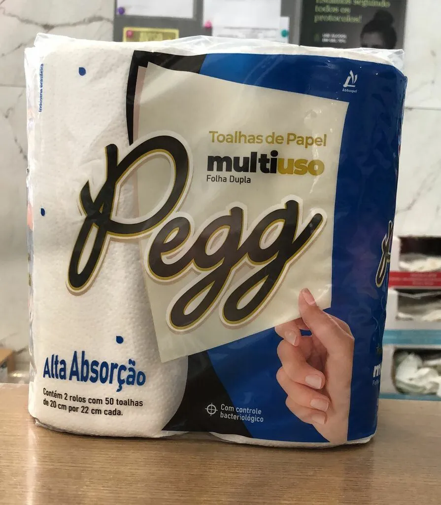Toalhas de Papel Multiuso Pegg Folha Dupla 2 Rolos 50 Tolhas Marca: Abbaspel Folha dupla de alta qualidade, Picotada e Alta Absorção Com Controle Bacteriológico COMPOSIÇÃO 100% celulose virgem MEDIDA Toalhas de 20 cm x 22 cm EMBALAGENS Pacote plástico com 2 rolos com 50 folhas de 20cm por 22cm | folha dupla