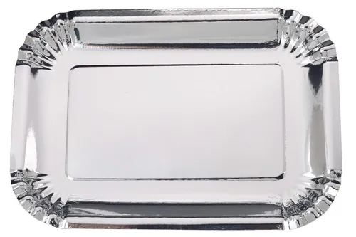 Prato de papel retangular estilo bandeja com face prata. Ideal para servir doces e outros com sofisticação!