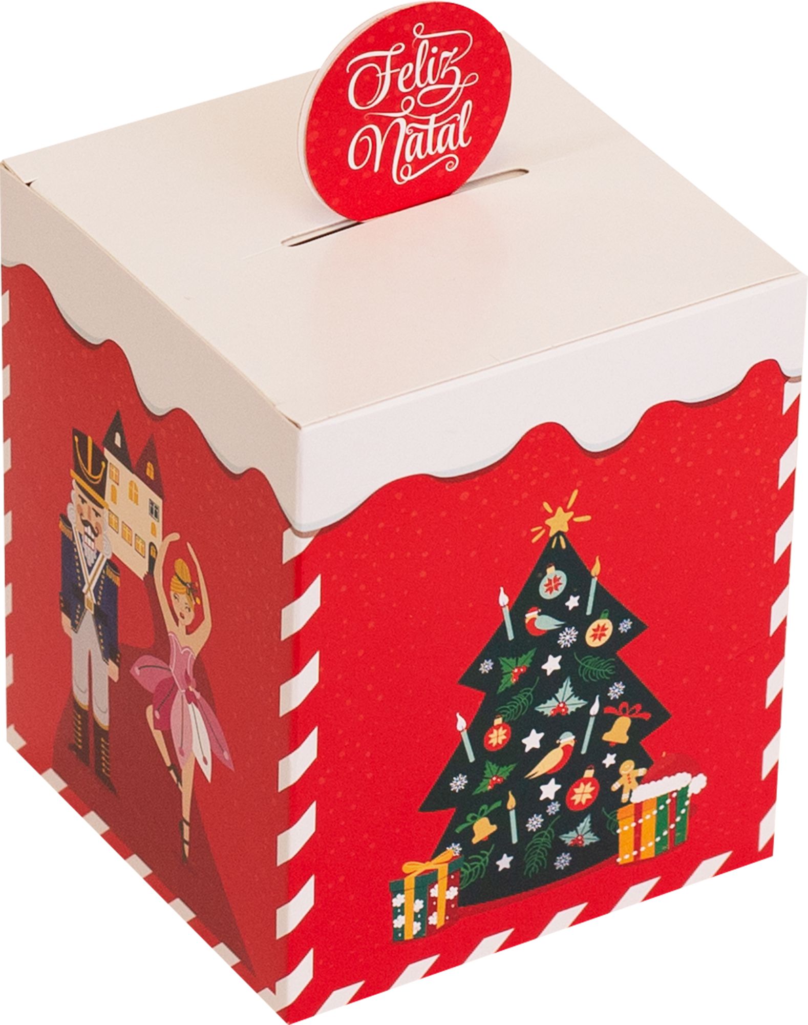 Caixa tipo Cubo com o tema natal mágico feito de papel cartão. Medidas da caixa montada são de 10 cm de largura x 12 cm de altura. Utilize para guardar seus doces e sobremesa. Pacote contém 10 unidades