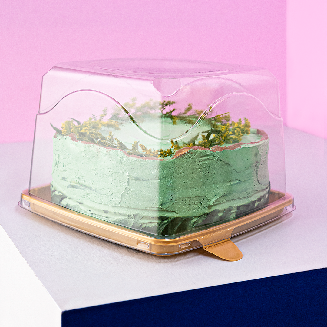 Material: PET Qtd. por caixa: 25 Cj Cor: Base: Dourada, tampa: Cristal Possibilidades de uso: bolo-confeitado, bolo-quadrado, tortas