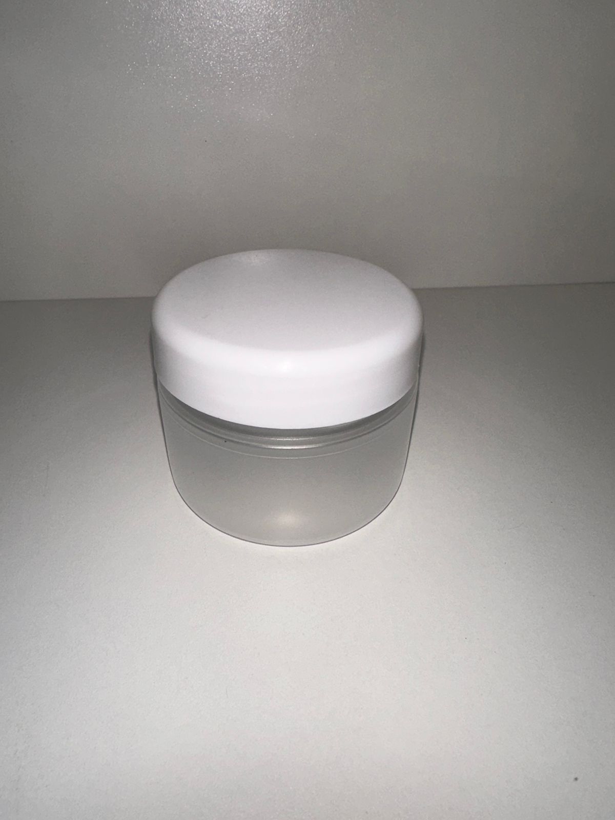 Pote plástico transparente não translúcido, capacidade 110ml e tampa plástica na cor branca
