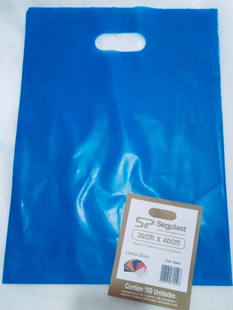 100 Sacola Plástica Boca De Palhaço Alça vazada Cor Azul 30x40