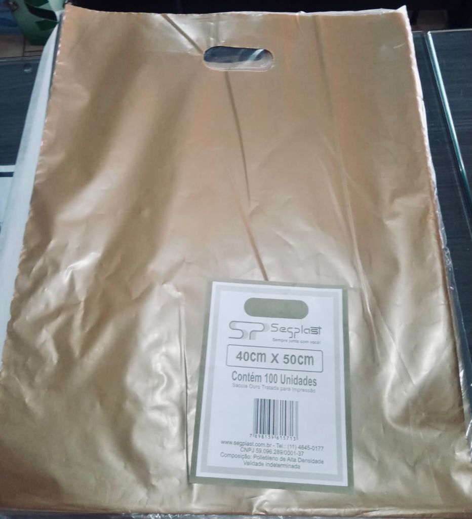 100 Sacola Plástica Boca De Palhaço Alça vazada Cor Ouro 40x50