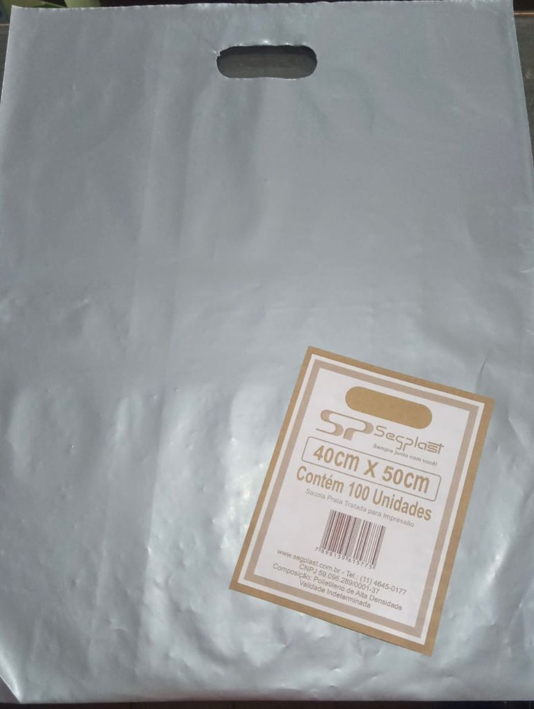 100 Sacola Plástica Boca De Palhaço Alça vazada Cor Prata 40x50