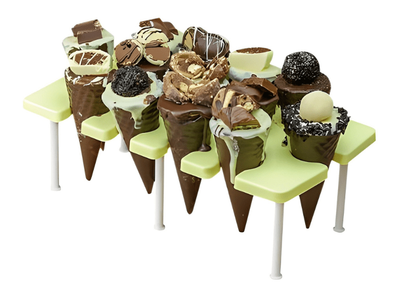 Sua produção de cones recheados ficará mais fácil com o suporte com pega cone 3pc. Com ele, você pode confeitar mais de dez cones recheados ao mesmo tempo, agilizando sua produção. Possui aberturas para apoiar a casquinha sem fazer sujeira e o pega cone, que é perfeito para banhar suas casquinhas por dentro e por fora. Use e abuse da sua criatividade na decoração, para que seus cones fiquem mais atraentes e deliciosos. O suporte com pega cone é de plástico compacto e fácil de montar.